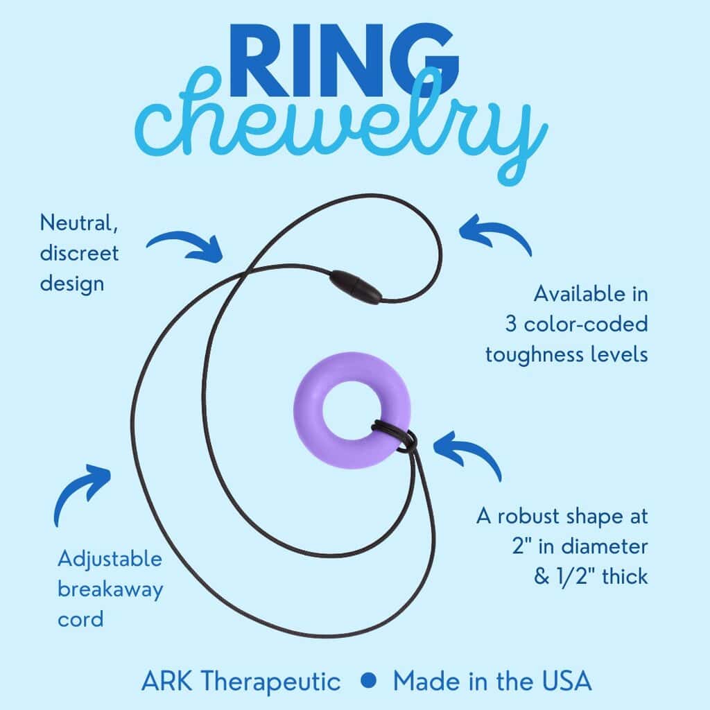 Need to chew?  Made in the USA, ARK’s Chewable Ring Necklace is a safe, stylish, and discreet solution for both kids and adults who need to chew. Measuring about 2″ in diameter and 1/2 inch thick, it’s a great option for those who like to chew with their front teeth.