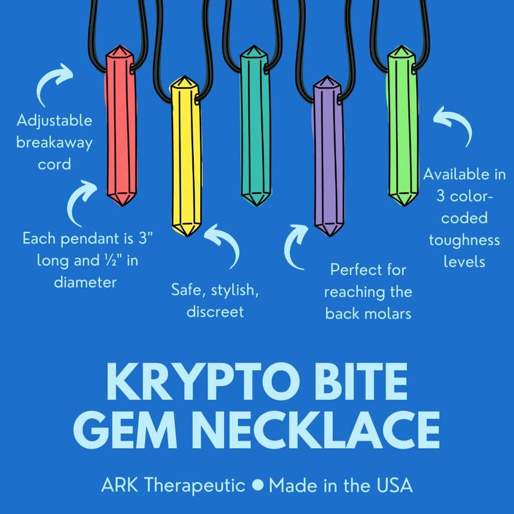 Made in the USA, ARK’s Krypto-Bite® Chewable Gem Necklace provides a safe, wearable, and discrete solution for kids and adults who need to chew. For boys, it’s cool-factor Krypto-Bite®. For girls, it’s a stylish gem pendant. Either way, it’s sure to be a hit! Use this “chewelry” as an oral fidget (or even hand fidget) to help calm, soothe, and self-regulate during times of stress, or to better focus during homework and other activities. Â