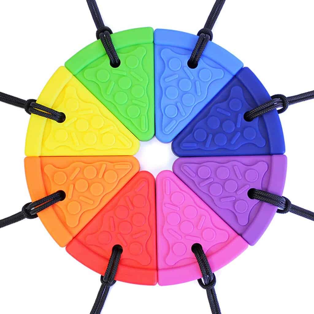Om nom nom!  ARK’s Pizza Chew Necklace is a slice of cheesy sensory oral motor fun.  Each “slice” measures 2″ tall, 1.75″ across the widest part, and (including the “toppings”) just under 1/2″ thick.  It’s a great option for those who prefer chewing with their pre-molars and/or front teeth (for more slender options that reach the back molars, click here).  And the textured “toppings” provide extra sensory interest.  Use the Pizza as a safe alternative to chewing on pencils, shirts, fingers, etc. and to help calm, focus, and self-regulate.