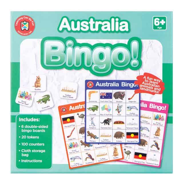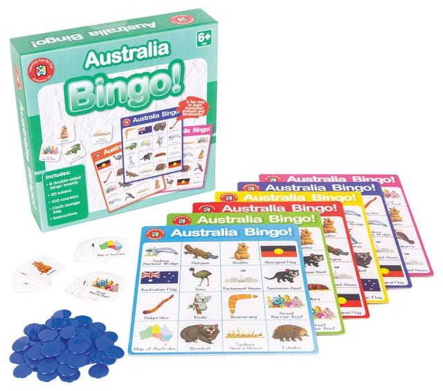 Australia Bingo is a valuable resource to encourage learning through play. This easy-to-play game will help children to become familiar with some of Australia’s most recognisable landmarks, native animals and cultural icons. Early learners will quickly learn more about Australia – while having fun! Includes: 6 Double sided bingo cards, 20 Tokens, 100 Counters, Cloth storage bag, Instructions.