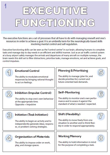 The “Executive Functioning” booklet outlines what executive functioning is, and how many neurodivergent people experience difficulties in such areas. Further, it looks at skills / strategies to support the person at school, home, or in the community.
