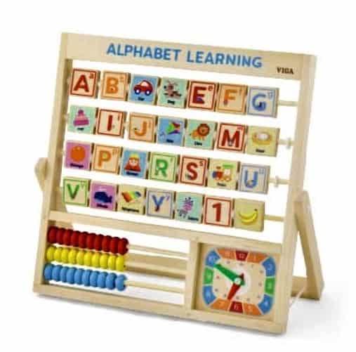 Flip the letters of the alphabet, move the clock hands or count with the beads. This learning frame is sure to help your child enjoy play time! This wooden table top alphabet learning frame contains a number counting frame and a clock learning pad. 3 in 1, multi-functional for extra fun. Kids can learn letters, numbers and get a general idea of a clock. Every letter has a word on the other side of it and it is easy for memorising. It encourages language and number skills. Size: 32.5 x 32 x 2.5 cm |