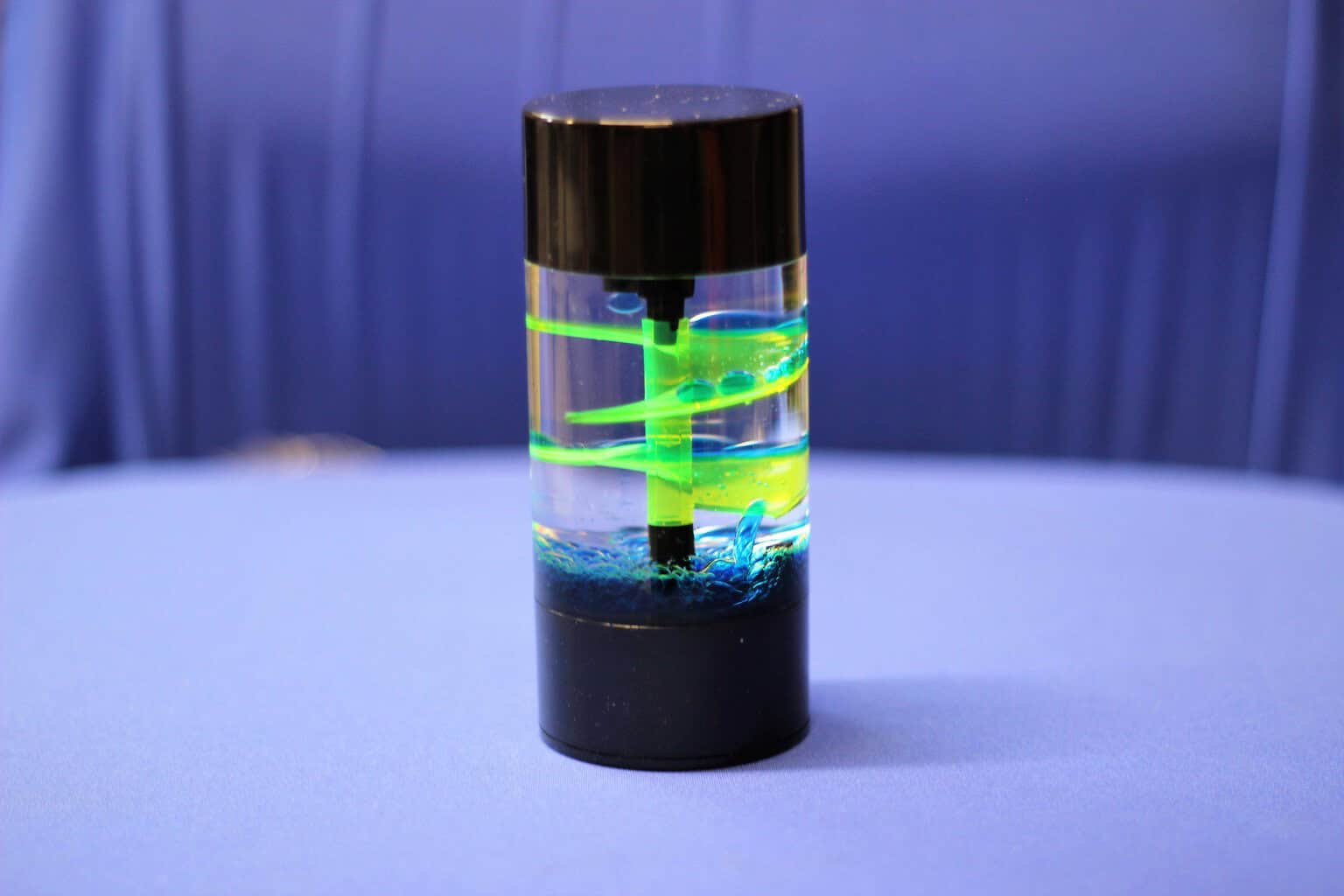 - Watch the gel droplets spiral down the spinning lamp to the bottom